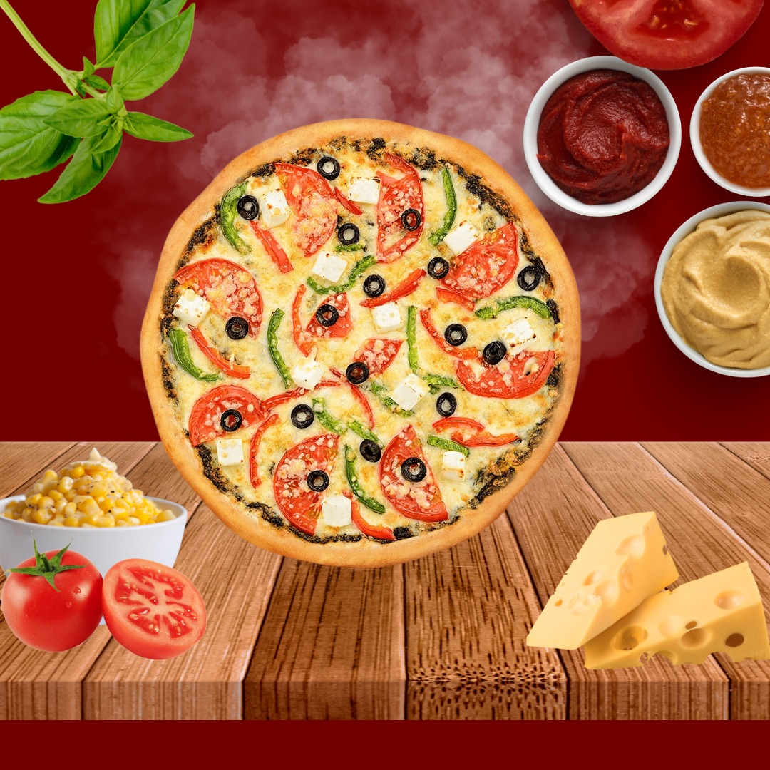 Tomaten, Mozzarella, Feta, Zwiebeln, Oliven, Oregano Wahl aus: Chili, Knoblauch,…